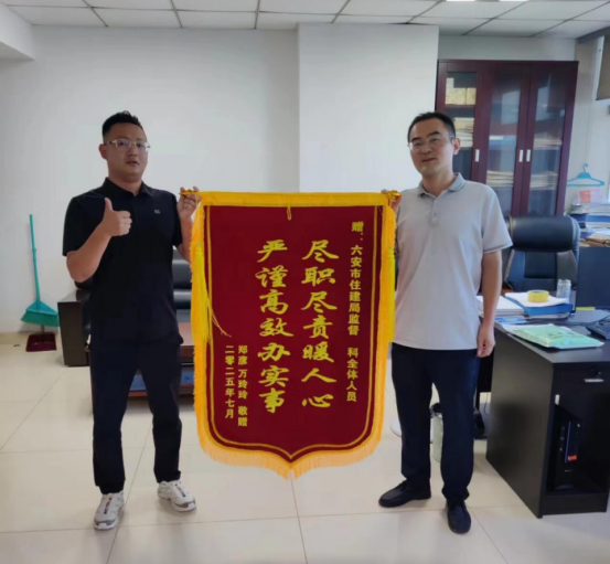 "尽职尽责暖人心,严谨高效办实事!"7月21日,家住万兴滨江府小区的郑先生将一面锦旗送到成人tv 质安处,红绸金字的背后,是住建干部用"铁脚板"踏出的民生温度,用"真担当"写就的服务篇章。