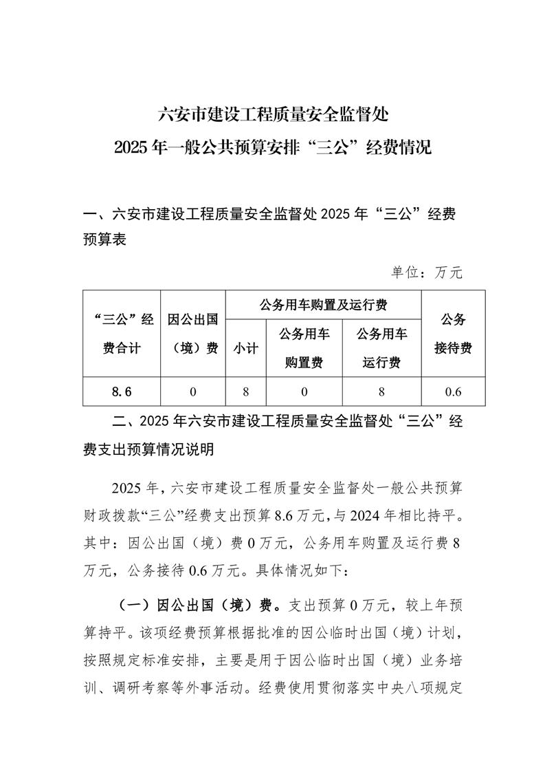 六安市建设工程质量安全监督处2025年一般公共预算安排“三公”经费情况