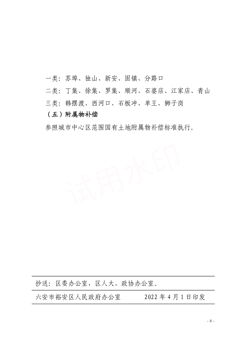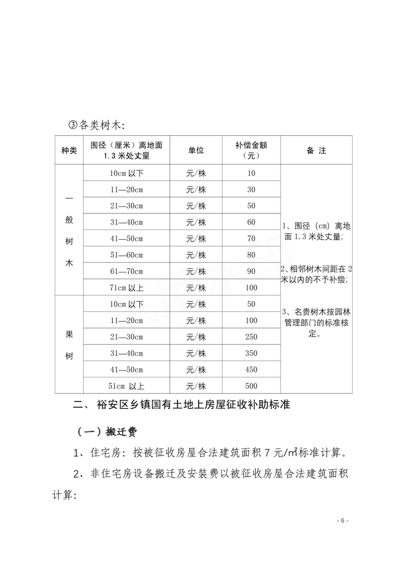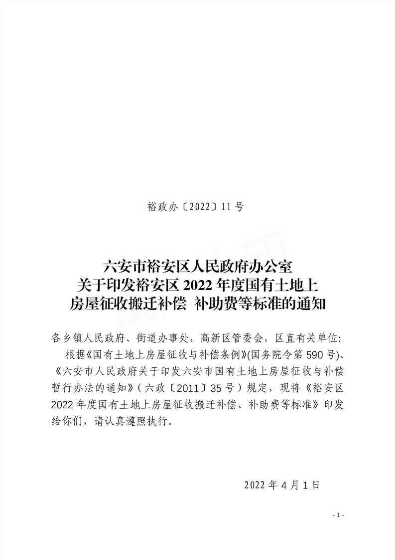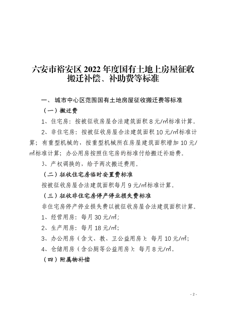 裕安区2022年度国有土地上房屋征收搬迁补偿、补助费等标准(2024年延用)