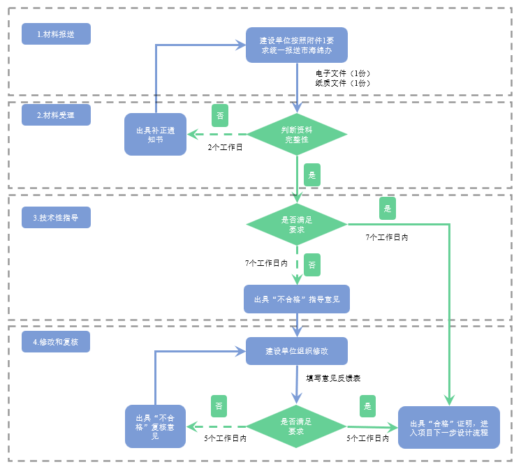 市海绵办根据《方案设计阶段报送材料清单表》要求判断报送材料是否完整。如报送材料不满足完整性要求,市海绵办2个工作日内出具《补正通知书》(详见附件3),并发送至建设单位邮箱;如报送材料完整,市海绵办将受理材料并对建设单位进行技术性指导。