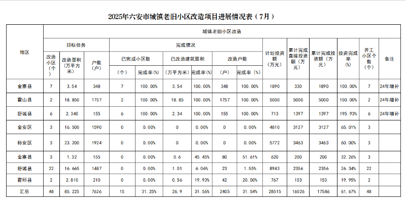 2025年六安市城镇老旧小区改造项目进展情况表(7月)