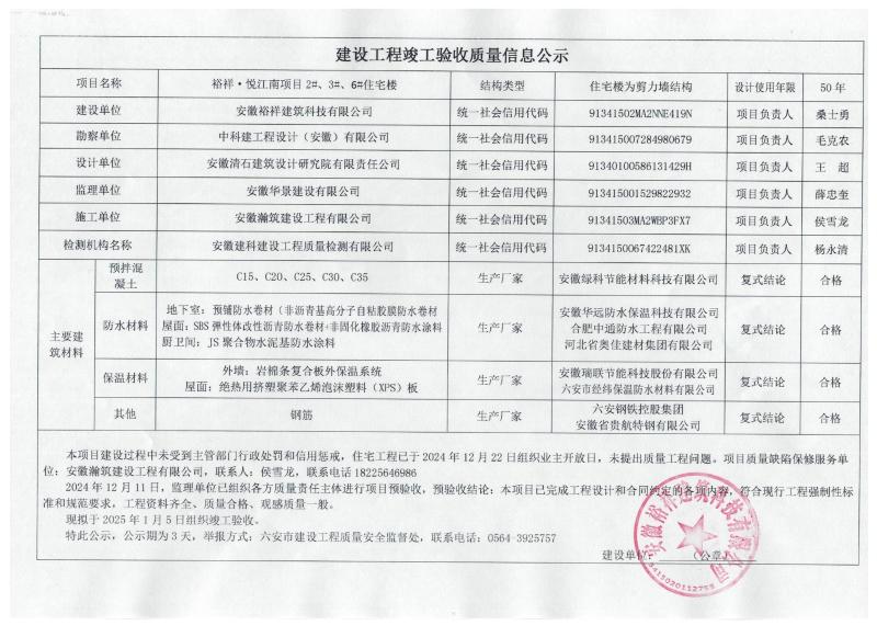 关于裕祥·悦江南项目2#、3#、6#住宅楼竣工验收的公示