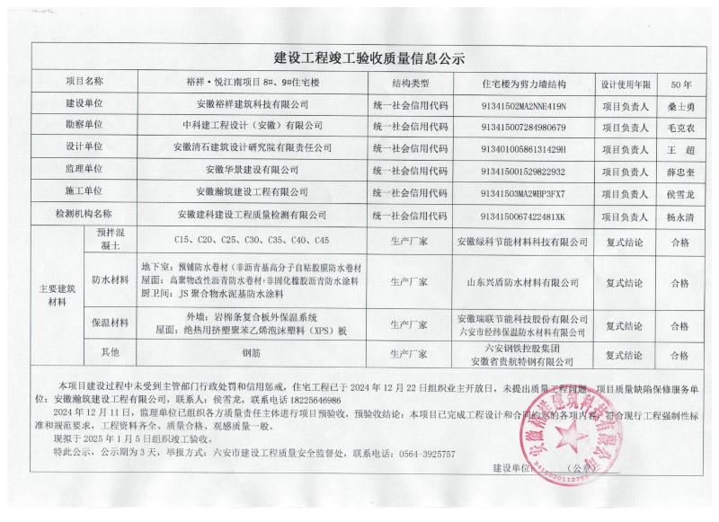 关于裕祥·悦江南项目8#、9#住宅楼竣工验收的公示