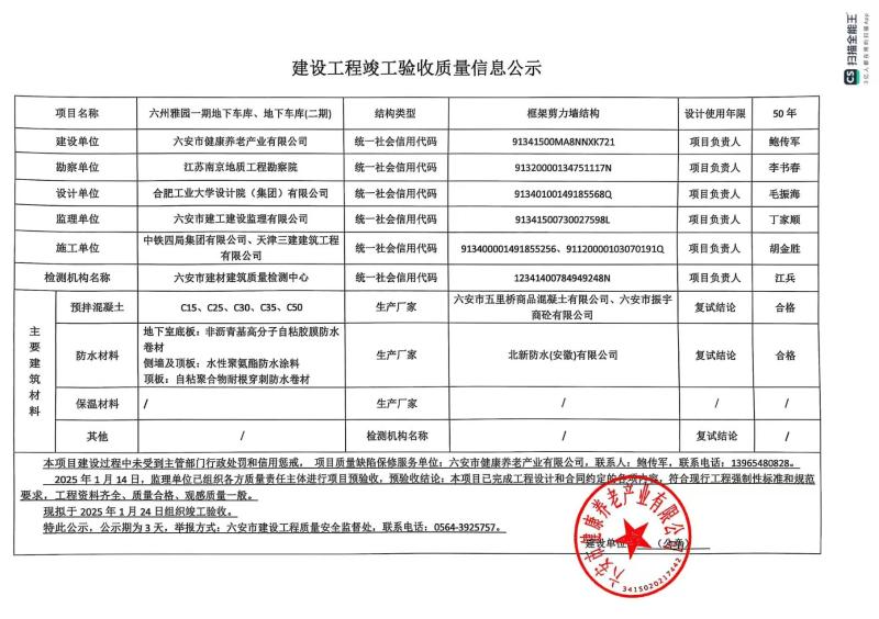 关于六州雅园一期地下车库、地下车库(二期)项目竣工验收的公示