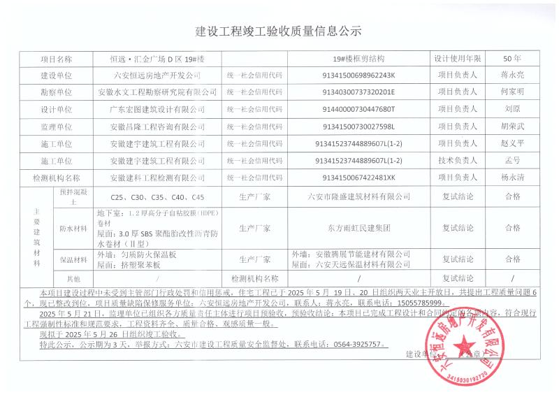关于恒远·汇金广场D区19#楼竣工验收的公示