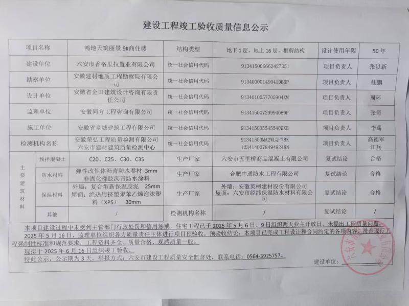 关于鸿地天筑丽景9#商住楼竣工验收的公示